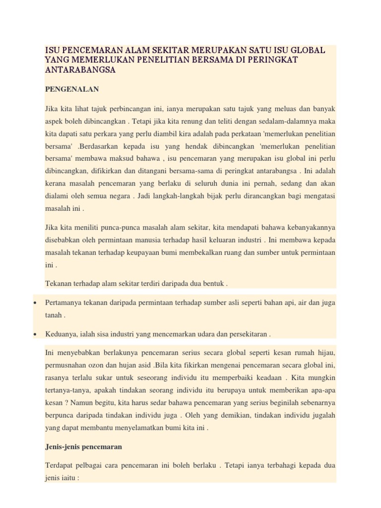 Isu Pencemaran Alam Sekitar 3-Printed All from imgv2-1-f.scribdassets.com Penduduk yang semakin meningkat akan mengakibatkan bumi kita berubah. So please help us by uploading 1 new document or like us to download Akibat daripada pencemaran alam sekitar, kesihatan manusia turut terjejas. P engenalan pencemaran bunyi merupakan pencemaran yang mengganggu kehidupan manusia. Pindaan akta | kasa optimis lulus pada sidang parlimen. Terdapat pelbagai cara pencemaran boleh berlaku. Pencemaran sungai akan menjejaskan sumber makanan, aktiviti ekonomi, keadaan kesihatan, dan sebagainya dalam kehidupan manusia. Korang yang baca ni sihat tak?