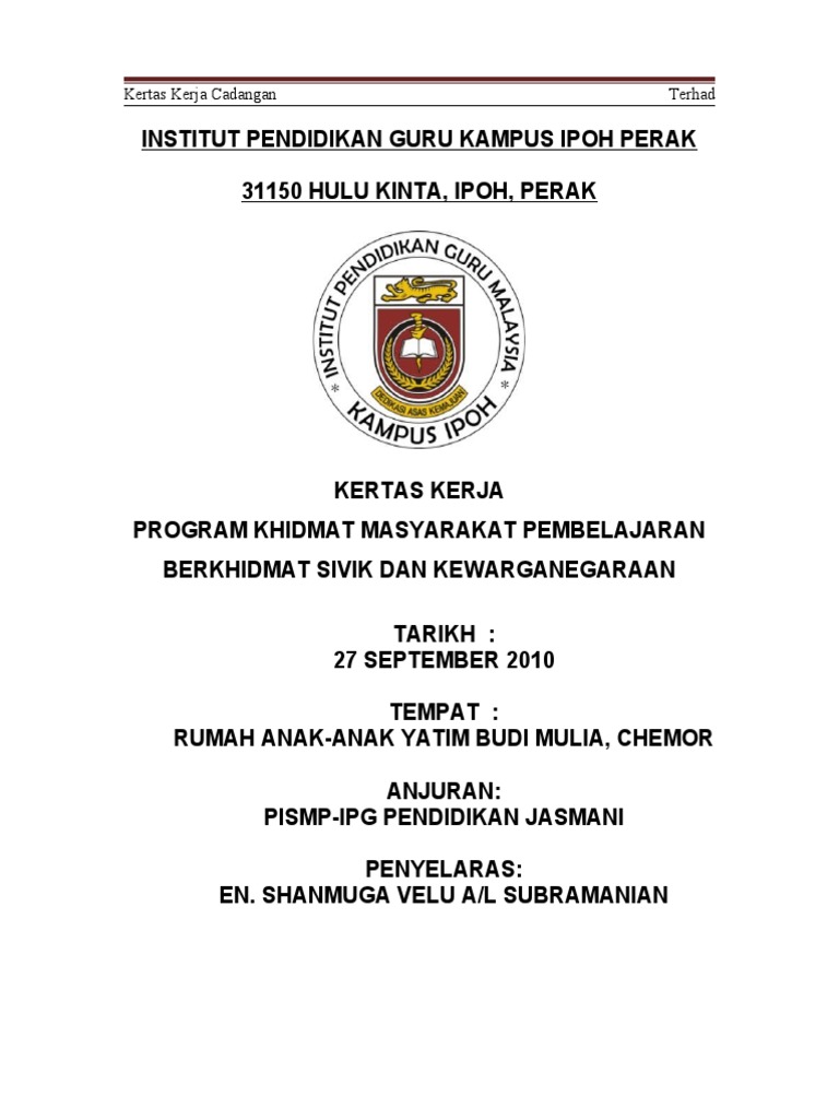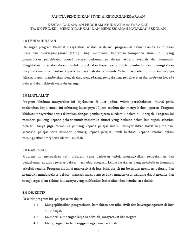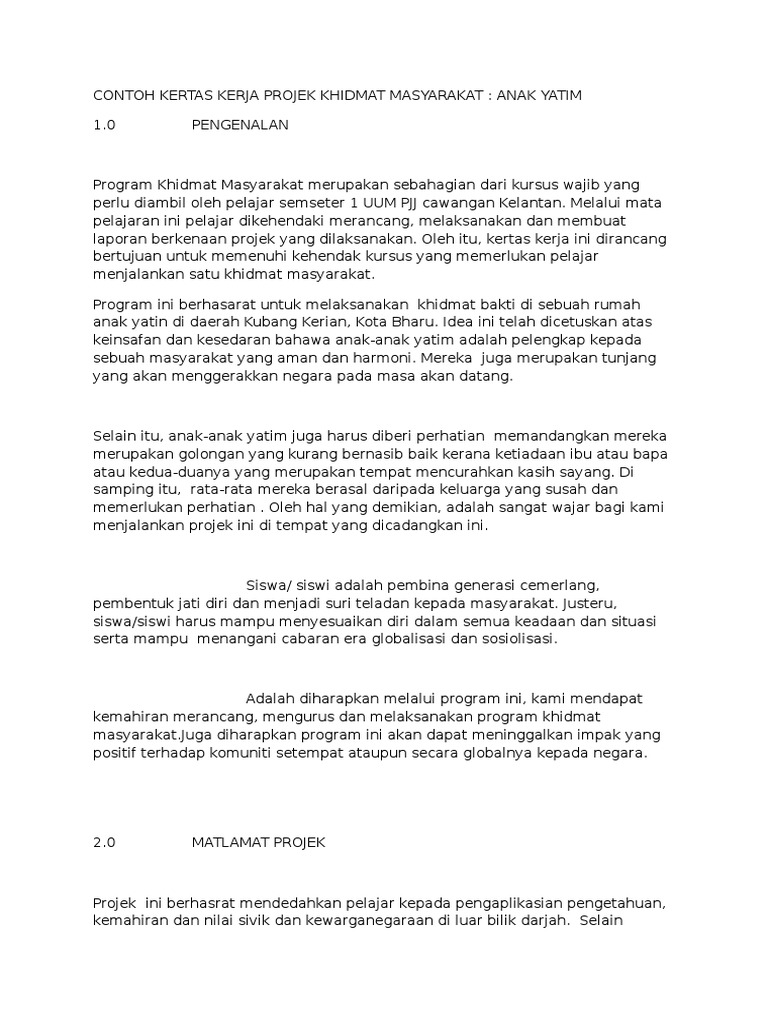 Kertas kerja kursus kepimpinan kokurikulum. Kertas kerja kelas tambahan sabtu. Kertas kerja cadangan bagi program khidmat masyarakat di rumah 3.0 objektif kajian 3.1 melengkapkan komponen kerja kursus iaitu 100% markah projek bagi kursus khidmat masyarakat 1 (mpu2412). Documents similar to contoh kertas kerja projek khidmat masyarakat. 3.0 objektif kajian 3.1 melengkapkan komponen kerja kursus iaitu 100 % markah projek bagi kursus khidmat masyarakat 1 (mpu2412).