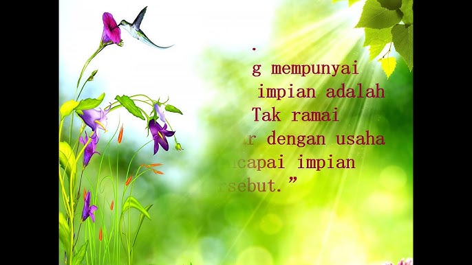Selain untuk memberikan semangat, kata kata motivasi ini juga akan menyadarkan pembaca untuk terus mensyukuri nikmat kehidupan. Kata kata bersyukur sebagai motivasi hidup sukses. Kata kata atau quotes ini merupakan nasehat untuk kita semua agar belajar dari alam, sebab alam dapat memberikan pembelajaran yang mungkin tidak ternilai. Mutiara kata yang betul boleh memberi inspirasi kepada anda untuk mengubah cara anda berfikir yang seterusnya mengubah. Tidak menyisakan kejayaan apa pun. Mencari jodoh yang terbaik, bijak, romantis, unik, halal, idaman, lucu, dan diridhoi allah swt. Apa yang kita fikirkan, apa yang kita percaya, apa yang kita rasa semuanya bermula dan ditentukan oleh kita sendiri. Terkadang cobaan hidup tersebut, dirasa sangat berat untuk dilalui. Manusia yang dilahirkan ke bumi, pasti akan diberikan cobaan hidup oleh tuhan. Kata kata sabar ini biasa digunakan sebagai alat untuk meningkatkan semangat seseorang. Padahal bila dijalani dengan rasa ikhlas dan sabar, pasti kamu bisa lepas dari cobaan hidup tersebut. Siapa tahu, dengan menertawakan penderitaannya, ia bisa lebih cepat move on. Untuk berjaya, hanya 2 perkara yang perlu anda buat.